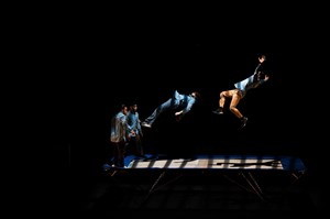 Hip hop autour d'un trampoline qui devient un souffle et une contrainte au mouvement dansé accompagné par la musicalité des gestes. Variation instable, "moovante" et vivante sur toile qui donne au public la vision atypique de l'expression chorégraphique, des corps projetés comme mis en orbite, une scénographie en mouvement, un hasard organisationnel.