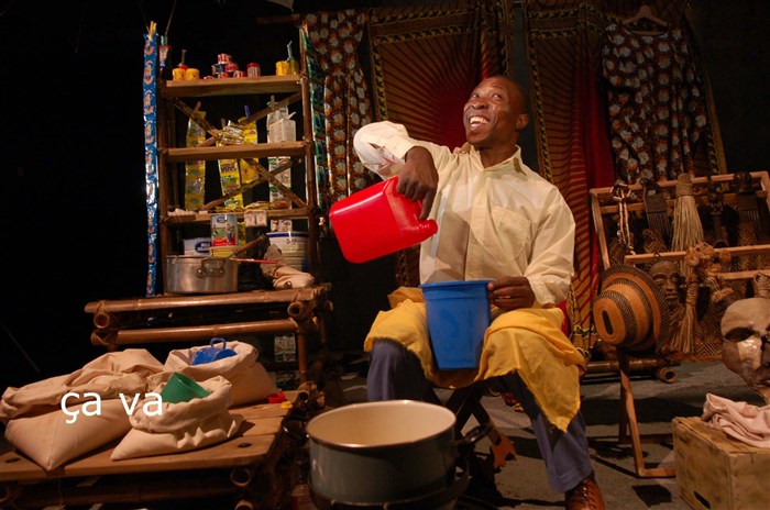 Tandis qu'au son de musiques dansantes, la fête du mariage s'organise, Basile construit son espace. Chaque objet déballé est prétexte à raconter la vie des petites gens de Kinshasa, par touches narratives, tour à tour colorées d'humour, d'absurdité, d'amour, de haines, de pouvoir, de solidarité, d'enfance...