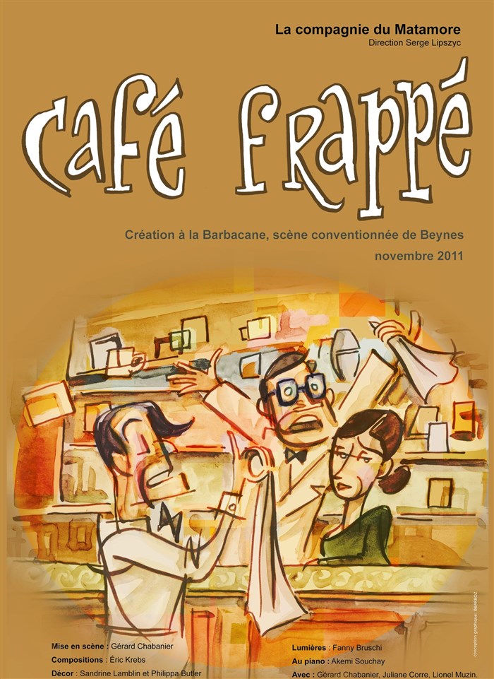 Comment retrouver cet esprit farfelu et salutaire de la grande époque ? C'est ce que la compagnie se propose de faire avec ce cabaret façon années cinquante : un retour aux sources, une plongée dans le cocasse. Sur scène, un cabaret délabré et trois comédiens, serveurs du Café Frappé, accompagnés par une pianiste japonaise déjantée. Chansons parodiques, calembours et sketches écrits à la manière de Pierre Dac et Francis Blanche rythment le spectacle.