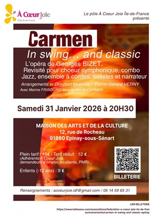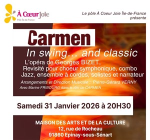 Carmen in Swing and Classic c'est une suite chorale avec combo jazz, choeur d'enfants, narrateur et une soliste lyrique. Il s'agit d'uneréécriture narrative de l'opéra de Bizet, dont l'histoire racontée par un comédien est ponctuéepar 10 pièces de l'opéra Carmen, parmi les plus connues, arrangées en jazz, pour choeur àtrois voix mixtes, piano, contrebasse, batterie et saxophones.