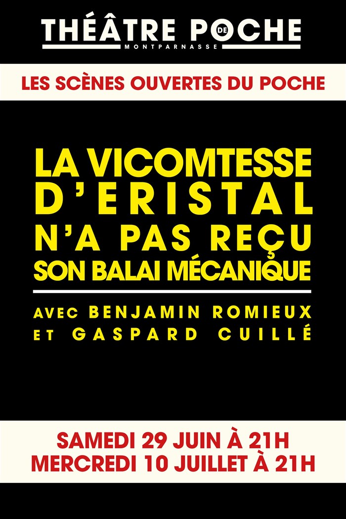 Après le succès d'Eurydice au Poche, Gaspard et Benjamin explorent les mémoires de Jean Anouilh. Dans La Comtesse d'Eristal n'a pas reçu son balai mécanique, le dramaturge jette un regard tendre et amusé sur ses débuts d'auteur sans le sou...