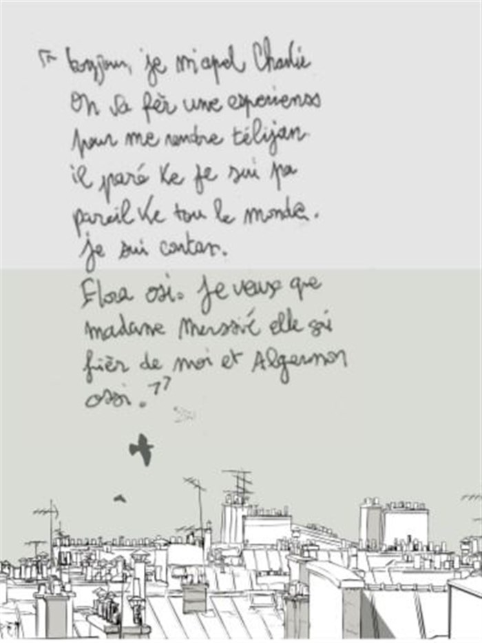 Je sui Charlie on va fer une esperiens pour me rendre intelijan, il paré ke je sui pa pareil ke tou le monde, je sui contan Flora osi. J esper que tu vien, j aime bien ken les jens vien."