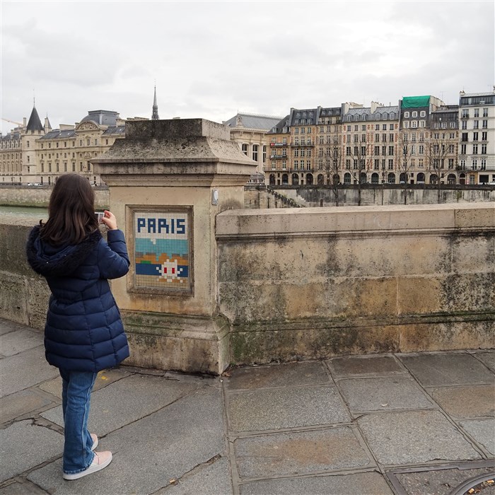 Suivez Camille et levez le nez pour dénicher 30 des 1500 mosaïques collées par le street-artiste français Invader sur les murs parisiens.
