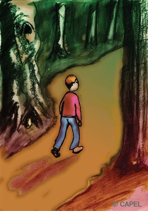 Au premier carrefour on s'arrêterait, on s'assoirait dans l'herbe, je vous raconterais une histoire et c'est elle qui nous indiquerait la direction à suivre. Comme ça on ferait un voyage dans les paysages. A la fin le chemin nous ramènerait ici dans le Chapeau Rouge ! Et là on saurait pas si on a voyagé pour de vrai, ou si c'était pour de semblant !"
