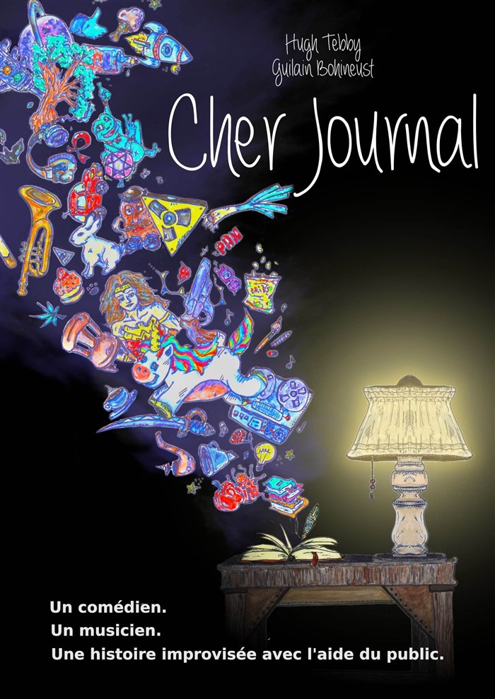 Le spectacle alterne les moments d'écriture, où le public participe activement, et les scènes improvisées par un comédien (Hugh Tebby) qui interprète tous les personnages et un musicien (Guilain Bohineust). Cher Journal est un spectacle musical, intimiste et onirique.
