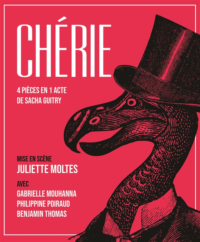 Sacha Guitry disait "L'amour à deux, ça dure le temps de compter jusqu'à trois" mais ce sont quatre de ses pièces qui vous sont présentées dans le spectacle Chérie : 4 pièces en un acte de Sacha Guitry ! Elles vous régaleront de leur humour, de leurs personnages hauts en couleur et de leur fantaisie ! Amour, colère, séduction ou suspicion, les sentiments fusent sous la main de la brillante metteur en scène Juliette Moltes, avec trois comédiens pétillants qui vous emporteront dans leur monde : Philippine Poiraud, Gabrielle Mouhanna et Benjamin Thomas ! Laissez- vous porter par les mots de Guitry et plongez avec eux dans son univers : vous ne serez pas déçus !