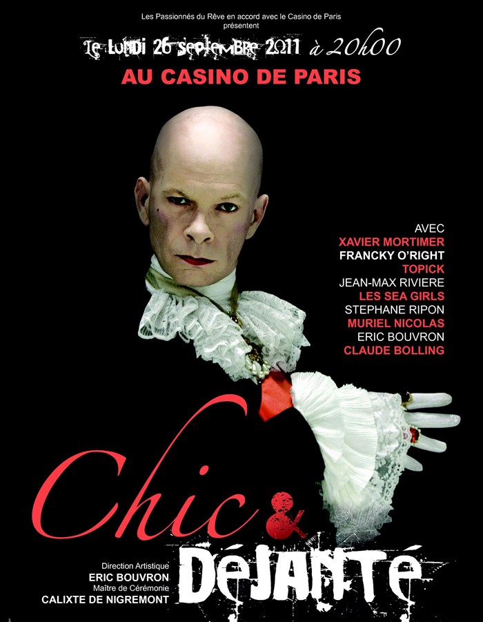 Calixte de Nigremont, maître de cérémonie aristocratique, Xavier Mortimer, magicien féerique, Topick, humoriste sportif, Francky O' Right, personnage burlesque dévastateur, Eric Bouvron globe trotteur franco-sud africain tendrement loufoque, Muriel Nicolas et Stéphane Ripon, danseurs, Jean-Max Rivière auteur de chansons pour Reggiani, Greco, Bardot et ses invités les Sea Girls vous convient à un spectacle Chic et Déjanté.