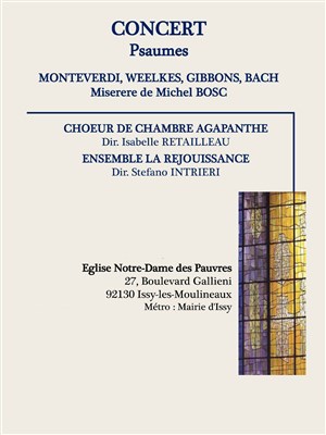 Ces textes poétiques d'essence musicale, chants de louange, d'exaltation ou de repentance, ont de tout temps inspiré les compositeurs. Vous entendrez lors de ce concert des psaumes de C. Monteverdi, H. Schütz, H. Purcell, J.S Bach, ainsi que le "Miserere pour chœur, orgue, basse de viole et violone" composé en 2015 par Michel Bosc pour l'ensemble Agapanthe.