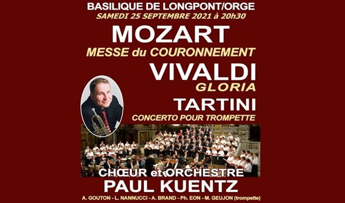 Le Choeur Paul Kuentz fêtera sa rentrée à la Basilique de Longpont. Le Gloria de Vivaldi et la Messe du Couronnement de Mozart deux oeuvres phares de la Chorale encadreront le Concerto pour trompette de Tartini joué pas le trompettiste n° 1 Marc Geujon, super-soliste à l'Opéra et professeur au CNSM de Paris.