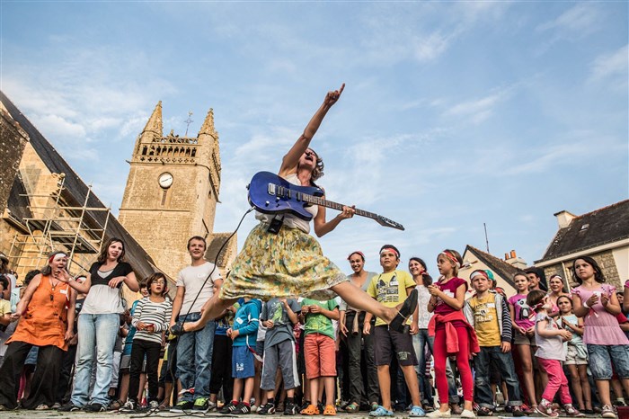 Chef de choeur au look vieille France, elle s'empare de la guitare électrique de son fils pour diriger sa nouvelle chorale : les spectateurs !