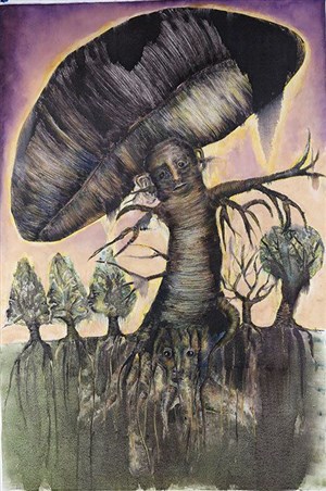 Quant aux papiers pliés ou Rohrschach, plongés dans différents bains d'encre puis déplo-yés, ils laissent apparaître des formes à partir desquelles l'artiste va faire surgir ses vi-sions : créatures zoomorphes, ramures de cerfs, masques, totems et fantômes... invitant le spectateur à pénétrer de l'autre côté du miroir et à rendre sensible les forces invisibles qui l'entourent.