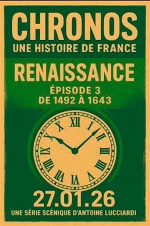 Chronos, c'est la toute première série scénique dédiée à l'histoire. Une création folle d'Antoine Lucciardi en exclusivité pour le Théâtre à l'ouest de Rouen.En sept épisodes explosifs et délirants, plongez dans les couloirs du temps pour un voyage à nul autre pareil. En sept épisodes, des origines à nos jours, croisez grandes figures et anonymes, revivez batailles et soubresauts politiques, innovations et créations qui ont façonné l'hexagone. Et grâce à l'urne du destin, vous pourrez vous aussi influer sur le cours du temps.
