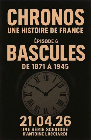 Chronos, c'est la toute première série scénique dédiée à l'histoire. Une création folle d'Antoine Lucciardi en exclusivité pour le Théâtre à l'ouest de Rouen.En sept épisodes explosifs et délirants, plongez dans les couloirs du temps pour un voyage à nul autre pareil. En sept épisodes, des origines à nos jours, croisez grandes figures et anonymes, revivez batailles et soubresauts politiques, innovations et créations qui ont façonné l'hexagone. Et grâce à l'urne du destin, vous pourrez vous aussi influer sur le cours du temps.