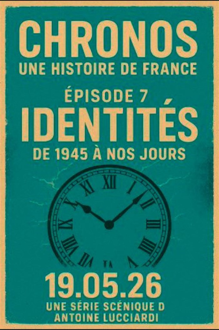 Chronos, c'est la toute première série scénique dédiée à l'histoire. Une création folle d'Antoine Lucciardi en exclusivité pour le Théâtre à l'ouest de Rouen.En sept épisodes explosifs et délirants, plongez dans les couloirs du temps pour un voyage à nul autre pareil. En sept épisodes, des origines à nos jours, croisez grandes figures et anonymes, revivez batailles et soubresauts politiques, innovations et créations qui ont façonné l'hexagone. Et grâce à l'urne du destin, vous pourrez vous aussi influer sur le cours du temps.