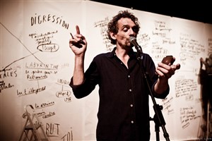 Benoît Bonnemaison-Fitte, affairé sur la page, inscrit, relève, dessine en mots, noircit et rend visible ce qui est dit.