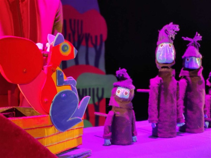 Pendant ce temps, un personnage plus petit offre de la nourriture à l'oiseau, attirant toute une troupe qui finit par chasser les chasseurs.