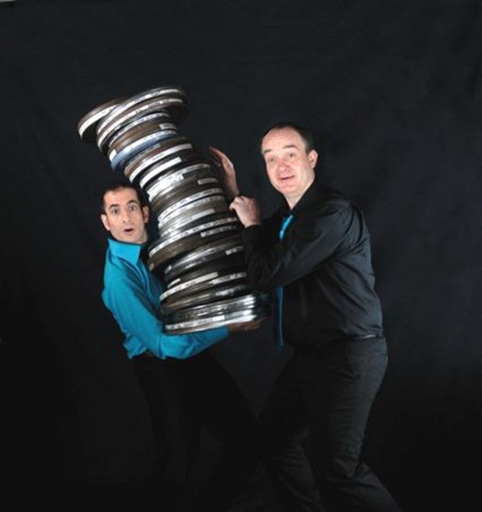 Deux machinistes sont chargés de ranger de vieilles boîtes métalliques contenant des bobines de films.