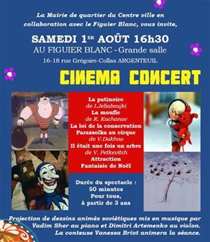 Projection de dessins animés soviétique mis en musique en direct au piano et violon. Séance animé par une conteuse.