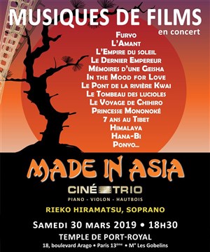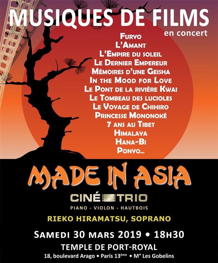 Un très beau moment avec le ciné trio, à écouter les plus grands thèmes du cinéma asiatique, et parfois même à les découvrir. Une belle complicité entre les musiciens de cet ensemble, une interprétation d'une grande qualité avec la présence d'une magnifique soprano. Bref, superbe moment..... Rendez vous déjà pris pour leur prochain concert sur les musiques d'Ennio Morricone... Nous avons adoré.