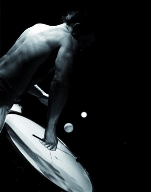" Côte à côte, à l'oeuvre sur des peaux tendues, l'un le geste pour le son, l'autre, dans le geste qui se déploie, l'un rivé au sonore, l'autre se jouant de la pesanteur, l'un tournant autour de la question du son, l'autre faisant tourner des balles dans ce son. L'un et l'autre dans un double mouvement entre ciel et terre, appuyés au sol pour un air vibrant. " Lê Quan Ninh.