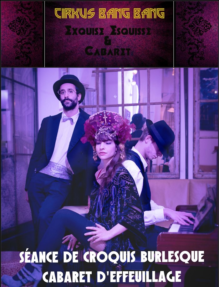 Cabaret d'effeuillage burlesque précédé d'une séance de pose de modèles vivants pour dessinateurs et photographes, avec un pianiste de jazz.