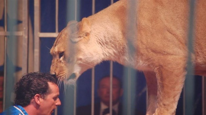 Le dompteur fait face aux tigres du Bengale et aux lionnes d'Afrique.