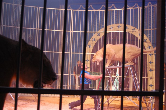Le dompteur fait face aux tigres du Bengale et aux lionnes d'Afrique.