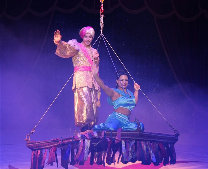 Un spectacle pour toute la famille dans un rythme endiablé avec une farandole de costumes, de lumières et d'effets spéciaux Prenez place sur le tapis volant et embarquez pour un voyage extraordinaire. Le conte des 1001 nuits, la grande caravane des animaux exotiques. Au détour d'une grande fête persane applaudissez clown acrobates équilibristes danseurs magiciens cavalerie... Rêvez devant l'idyllique envolée aérienne de Jasmine et Aladin Frémissez devant les tigres et lionnes. Frissonnez avec les fantastiques trapézistes volants. Vous trouverez les personnes emblématiques du célèbre conte et bien d'autres surprises.