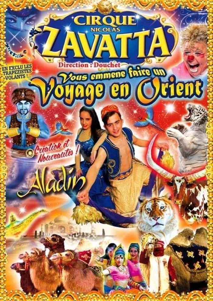 Au détour d'une grande fête persane, applaudissez clowns acrobates, équilibristes, danseurs, magiciens, cavalerie... Rêvez devant l'idyllique envolée aérienne de Jasmine et Aladin. Frémissez devant les tigres et lionnes. Frissonnez avec les fantastiques trapézistes volants. Vous retrouverez les personnages emblématiques du célèbre conte et bien d'autres surprises. Venez rêver avec les artistes du grand cirque Zavatta.