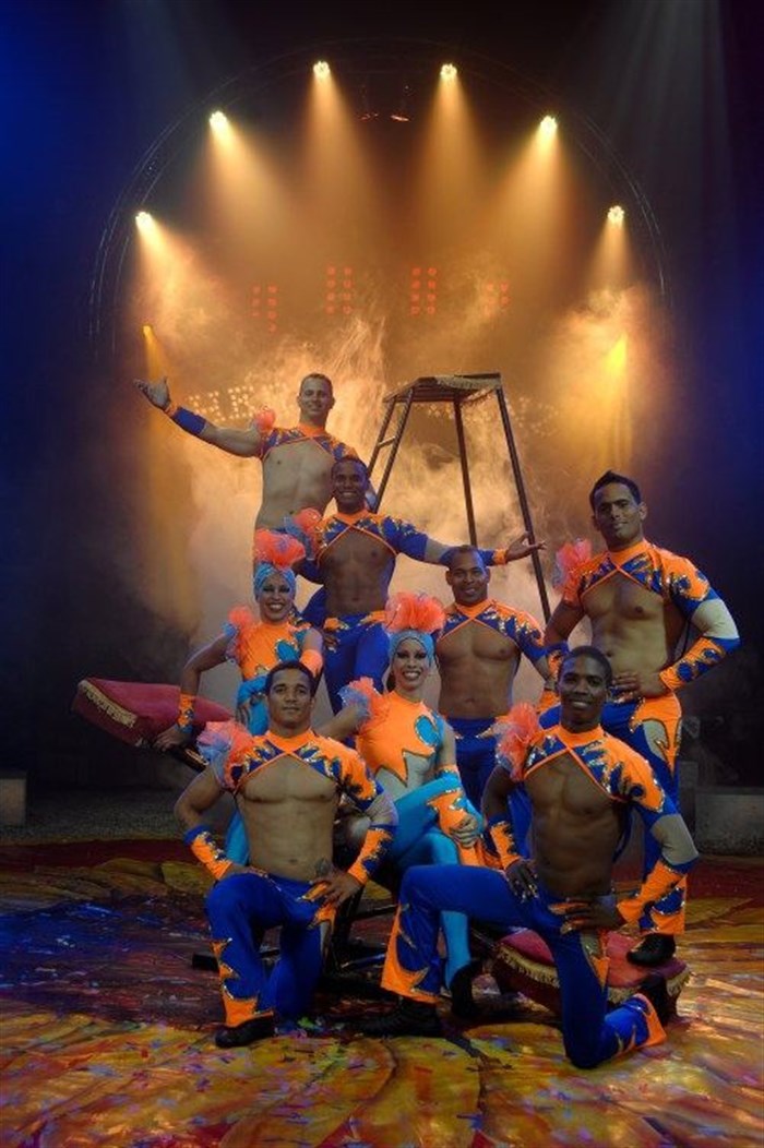 Cirque traditionnel avec animaux, ouvert sur la culture acrobatique Cubaine, trapèze volant, et clowns.