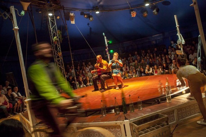 Progressivement, ce spectacle musical et acrobatique laisse surgir de belles séquences oniriques et décalées, des numéros d'aériens vertigineux, des assiettes sur lesquelles ils déambulent, une petite voiturette qui tourne autour de la piste, une installation de bouteilles qui devient un instrument ludique...