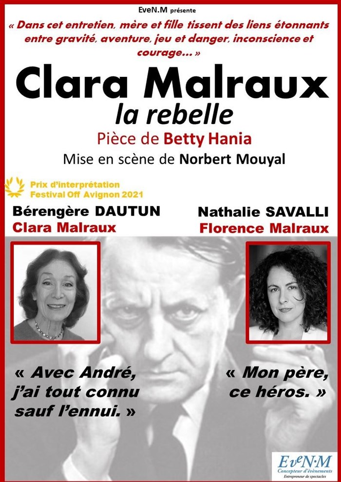 "Clara Malraux la rebelle" cette pièce va intéresser petits et grands par la traversée de la Grande Histoire du 20ème Siècle et de celle, plus intime, de la famille Malraux. Bérengère Dautun obtint le Prix "Meilleure comédienne au Festival Off 2021"