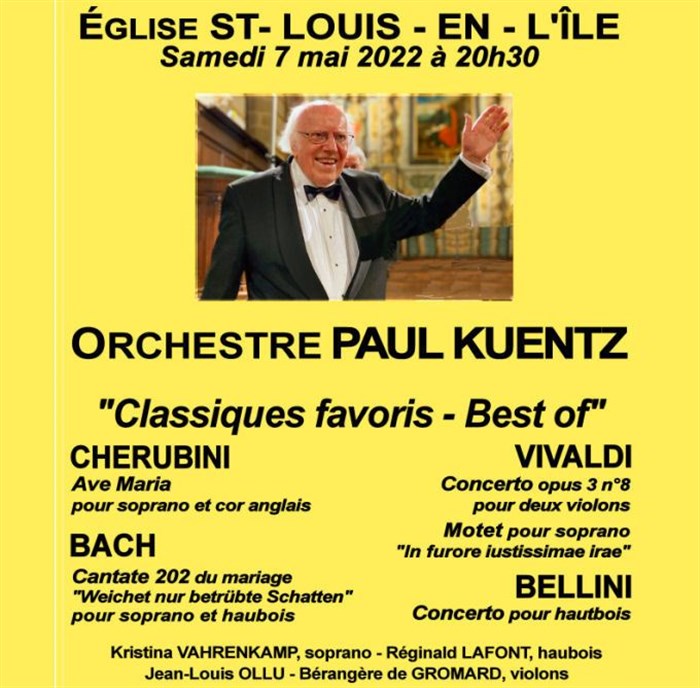 Le maestro Paul Kuentz présente avec son orchestre un nouveau programme "Classiques favoris - Best of" avec ses remarquables solistes : la soprano allemande Kristina Vahrenkamp, le hautboïste Reginald Lafont, et les violonistes Jean-Louis Ollu et Bérangère De Gromard.