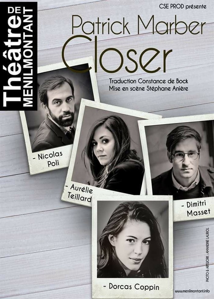 J'ai vu CLOSER lors de sa première représentation vendredi 7 octobre, j'ai passé un super moment de théâtre. La pièce dure 2h, très bien orchestrée, on ne s'ennuie jamais. Une mise en scène simple mais très efficace, qui met en valeur des acteurs volontaires et généreux. De super acteurs, avec une super mise en scène, pour un super moment. MERCI !
