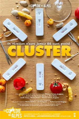 Après Crétins des Alpes et Le malade malgré lui, Thomas Caruso Aragona signe, avec Cluster, une comédie sociétale loufoque digne des pires parties de Cluedo de l'histoire du Cluedo. Un huis-clos grinçant à 6 comédiens et 3 animaux empaillés.