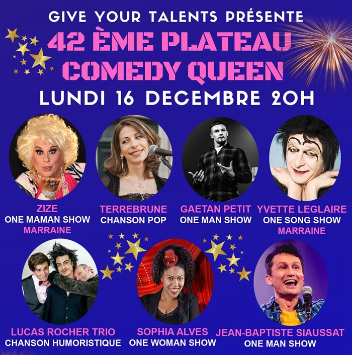 Pour cette 42ème Edition du Plateau Comedy Queen des Marraines de choix nous accompagneront : Zize et son One Maman Show génial, actuellement en tournée dans le Monde Entier ! Mais aussi l'inimitable Yvette Leglaire, une tornade de l'humour qui nous fera chanter, lauréate de l'émission La France a un Incroyable Talent sur M6 ! Elles accompagneront de leur bienveillance de superbes talents !