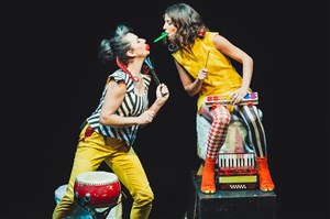 Les deux chanteuses musiciennes chantent ensemble, se répondent et vous emportent dans une pyramide d'histoires à la fois poétiques et funambulesques. Elles rient, se déguisent, vous confrontent avec humour et complicité à ce qui dérange. Et la magie opère !