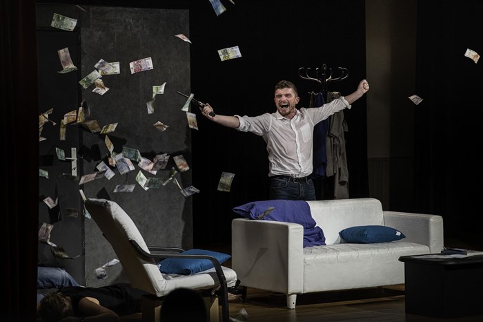 Un soir, Bruno et Laurence trouvent un billet de cent euros dans leur salon. Puis plusieurs. Des liasses de billets viennent chaque jour envahir leur appartement, comme s'il en pleuvait ! D'abord intrigués, puis paniqués par cet argent tombé du ciel, ils se retrouvent rapidement confrontés à leurs divergences de comportements et à leurs frustrations enfouies. Quand un voisin paranoïaque et armé, qui prétend avoir été volé, frappe à leur porte, Bruno et Laurence basculent dans la folie...