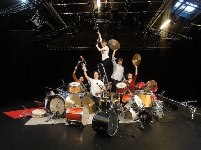 Création collective d'un spectacle à la forme explosive et au rythme tonitruant par 3 clowns et 2 batteurs.