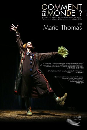 Voir plusMarie Thomas est une comédienne rare,surdouée qui, "sol" en piste,émeut, fascine,touche au coeur sous ses airs d'amuseur tout public.Dans son habit de clown naïf,elle sublime un texte d'une portée" planète-terre" dense,d'une richesse inouïe, nous offrant sa vision du monde.Jeux de" maux"... Oranginal,Agitateur d'inconscience...Jubilatoire,poétique, à fleur de peau.Je ne me lasse pas de ce petit bijou que je vois pour la cinquième fois.Marie Thomas a je ne sais quoi d'unique qui va bien au de la du talent!Admirable!