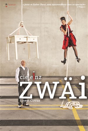 ZWÄI est une pièce circassienne proposée par la compagnie E1NZ (Suisse). Ce duo, formé par Esther et Jonas Slanzi mêle différents genres artistiques et prouesses esthétiques: au théâtre et à la musique, ils y ajoutant les arts du cirque.