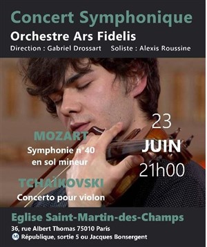 L'Académie Ars Fidelis, qui est une formation sélective de musiciens d'un niveau de fin de 3ème cycle des conservatoires, ou jeunes professionnels, interprétera la très célèbre 40ème symphonie de W.A.Mozart en première partie du concert, dirigée par le jeune chef d'orchestre plein d'enthousiasme Gabriel Drossart.