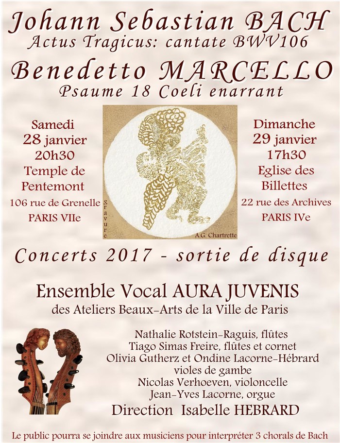 Isabelle Hébrard : direction. Concert donné à l'occasion de la sortie du CD consacré à la cantate Actus Tragicus de Johann Sebastian Bach, une extraordinaire oeuvre du jeune compositeur écrite vers 1707 , et au psaume 18 Coeli Enarrant de Benedetto Marcello extrait de son oeuvre maîtresse "L'Estro Poetico-Armonico" publiée en 1725 à Venise.