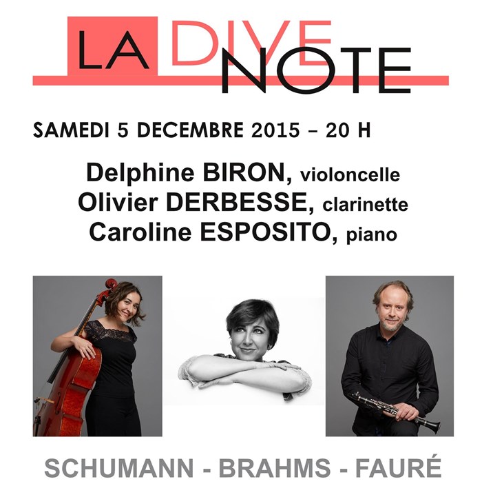 La Dive Note vous propose un concert de musique de chambre avec Delphine Biron au violoncelle, Olivier Derbesse à la clarinette et Caroline Esposito au piano.
