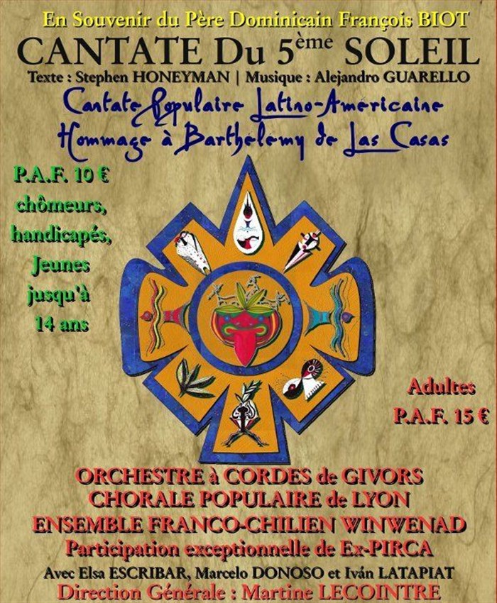 Presque 100 artistes sur scène pour interpréter la Cantate "Du Cinquième Soleil" dont le texte est du poète chilien Stephen Honeyman et la musique du grand compositeur chilien Alejandro Guarello. Cette Cantate dont François Biot fut le commanditaire, est un hommage à Barthélemy de Las Casas, défenseur des peuples originaires de la Grande Amérique. Œuvre pour orchestre, choeur et groupe Andin.Sous la direction de Martine Lecointre se trouveront: L'orchestre à cordes de Givors,la Chorale Populaire de Lyon,l'ensemble poético-musical franco-chilien Winwenad et ex-Pirca, épaulés par nos amis Cristian Reyes Montoya et Percy Rojas de Yawar Masi , par les auteurs-compositeurs chiliens Marcelo Donoso et Iván Latapiat et la présence de notre chère amie Elsita Vasquez Escribar en tant que recitante.Collaboration esthétique de l'artiste plasticienne Marta Gutierrez- Araneda