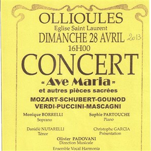 Vivaldi et son Gloria, Haëndel et son Messie, Mozart et sa Messe du Couronnement, Puccini et sa Messa di Gloria, ainsi que Gounod et son Ave Maria entre autres... seront interprétés par la soprano Monique Borrelli, le ténor Danièle Nutarelli.