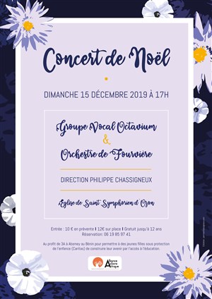 Le groupe vocal Octavium, dirigé par Philippe Chassigneux, vous propose un concert de Noël, moment de paix, de partage et de joie à travers une musique au diapason de la fête de Noël en solidarité avec l'association 3A Alliance Action Afrique. Au Benin, à Abomey et Bohicon, 56 jeunes filles âgées de 8 à 18 ans vivent dans deux foyers de protection de l'enfance (Caritas).