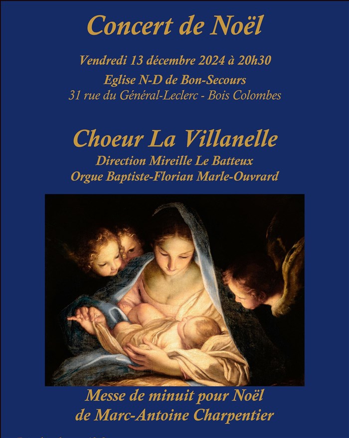Cette année, Mireille le Batteux et le Choeur La Villanelle auront grand plaisir à retrouver exceptionnellement Baptiste-Florian Marle-Ouvrard - talentueux organiste - pour un programme baroque composé principalement de la Messe de minuit pour Noël " de Marc-Antoine Charpentier et de la "Cantate de Noël" de Louis-Claude Daquin.