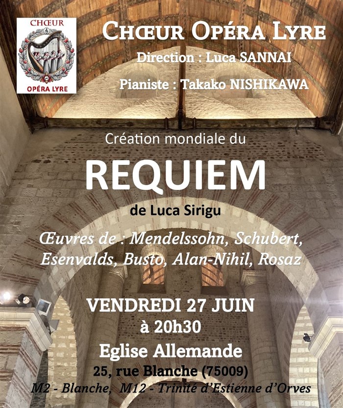 Creation Mondiale du Requiem de Luca Sirigu et oeuvres de : Mendelssohn, Schubert, Esenvalds, Busto, Alan Nihil, Rosaz.