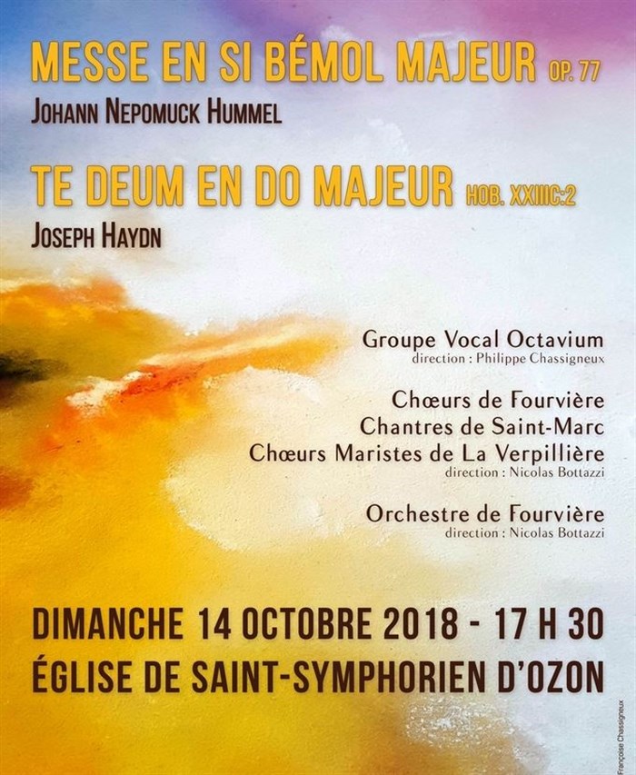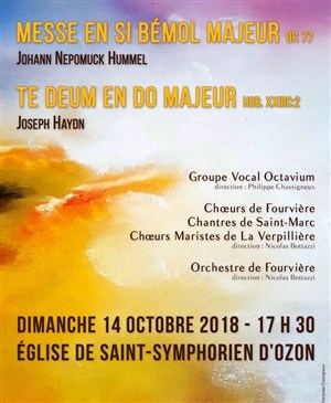 Concert donné par le choeur Octavium de Saint Symphorien d'Ozon (direction Philippe Chassigneux), les choeurs de Fourvière, les choeurs de la Verpillière (direction Nicolas Bottazzi) et 30 musiciens de l'orchestre de Fourvière qui interpréteront aussi la Symphonie n°82 " L'Ours " de Haydn.